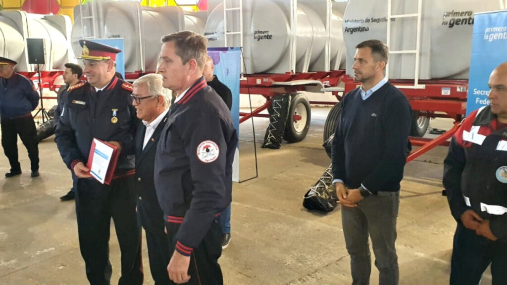 El Ministerio de Seguridad entregó equipamiento para diez cuarteles de la provincia de Buenos Aires, entre ellos San Pedro. Los Bomberos recibieron un cisterna móvil de 10 mil litros, un tanque fijo y dos tanques bolsa.
