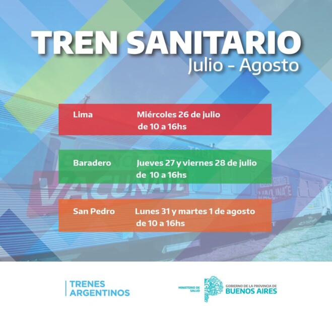 La Municipalidad de San Pedro informa que, el próximo lunes 31 de julio y el martes 1 de agosto, el Tren Sanitario regresará a nuestra ciudad a través de una iniciativa conjunta entre el Ministerio de Salud de la Provincia de Buenos Aires y Trenes Argentinos, dependiente del Ministerio de Transporte de la Nación.